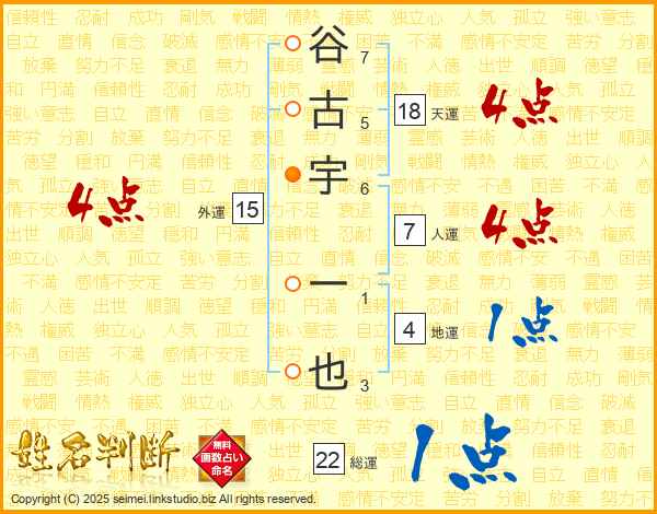 谷古宇一也さんの人運は7画の4点!