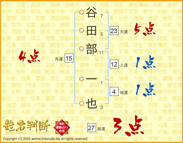 谷(7画)田(5画)部(11画) 一(1画)也(3画)