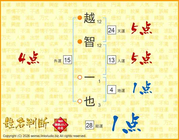 生活面を象徴する運勢です。外部から受ける影響力を表し、結婚運、家庭運や職場、環境への順応性を表します。総運から人運を引いた画数。姓や名が1文字の場合を除く。