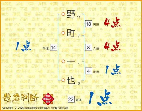 生活面を象徴する運勢です。外部から受ける影響力を表し、結婚運、家庭運や職場、環境への順応性を表します。総運から人運を引いた画数。姓や名が1文字の場合を除く。