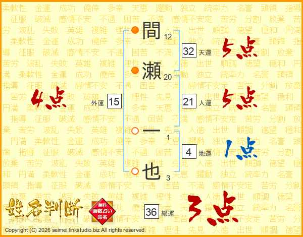 生活面を象徴する運勢です。外部から受ける影響力を表し、結婚運、家庭運や職場、環境への順応性を表します。総運から人運を引いた画数。姓や名が1文字の場合を除く。