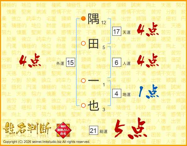 生活面を象徴する運勢です。外部から受ける影響力を表し、結婚運、家庭運や職場、環境への順応性を表します。総運から人運を引いた画数。姓や名が1文字の場合を除く。