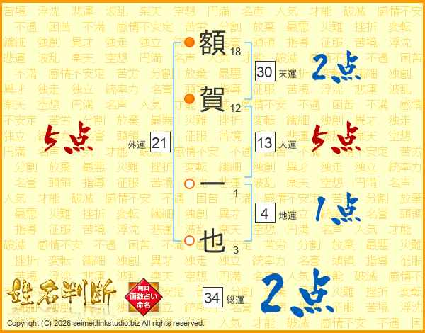 額(18画)賀(12画) 一(1画)也(3画)