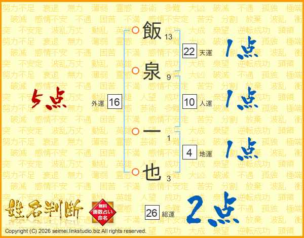 飯泉一也さんの総運は26画の2点!