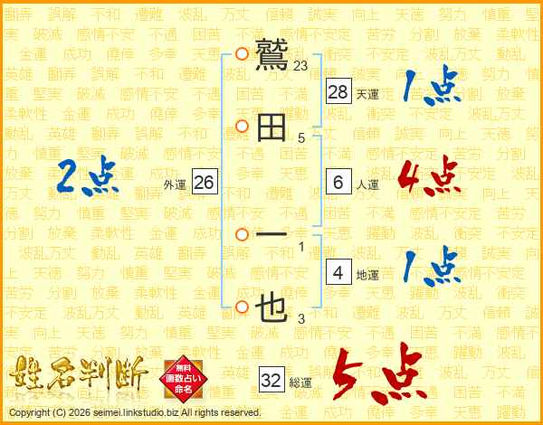 鷲(23画)田(5画) 一(1画)也(3画)