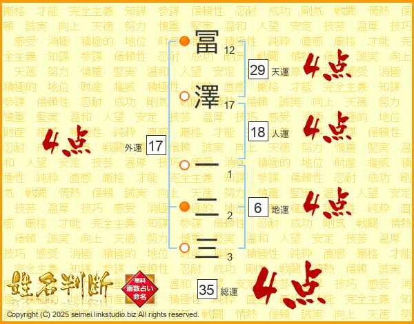 生活面を象徴する運勢です。外部から受ける影響力を表し、結婚運、家庭運や職場、環境への順応性を表します。総運から人運を引いた画数。姓や名が1文字の場合を除く。