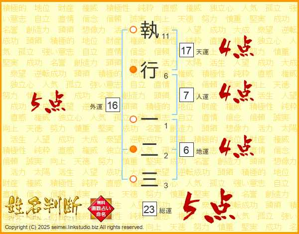 生活面を象徴する運勢です。外部から受ける影響力を表し、結婚運、家庭運や職場、環境への順応性を表します。総運から人運を引いた画数。姓や名が1文字の場合を除く。