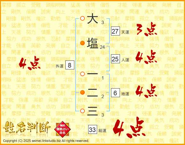 大塩一二三さんの総運は33画の4点!