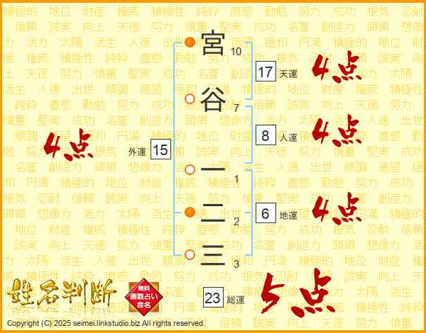 生活面を象徴する運勢です。外部から受ける影響力を表し、結婚運、家庭運や職場、環境への順応性を表します。総運から人運を引いた画数。姓や名が1文字の場合を除く。