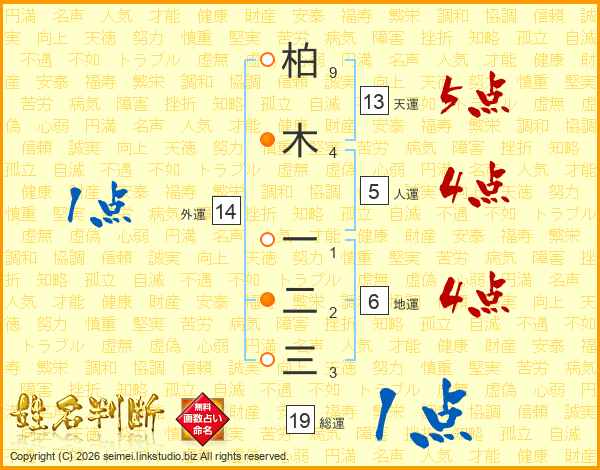 生活面を象徴する運勢です。外部から受ける影響力を表し、結婚運、家庭運や職場、環境への順応性を表します。総運から人運を引いた画数。姓や名が1文字の場合を除く。