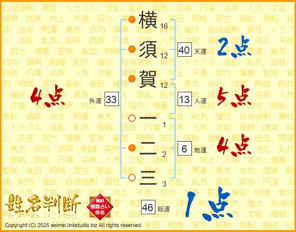 横(16画)須(12画)賀(12画) 一(1画)二(2画)三(3画)