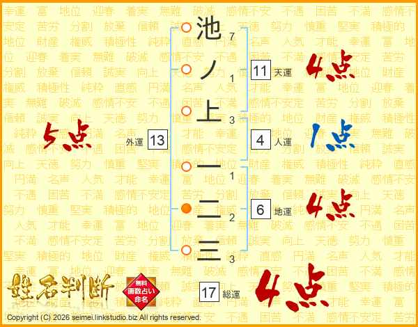 生活面を象徴する運勢です。外部から受ける影響力を表し、結婚運、家庭運や職場、環境への順応性を表します。総運から人運を引いた画数。姓や名が1文字の場合を除く。