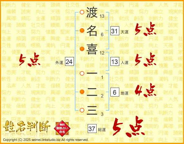 渡(13画)名(6画)喜(12画) 一(1画)二(2画)三(3画)