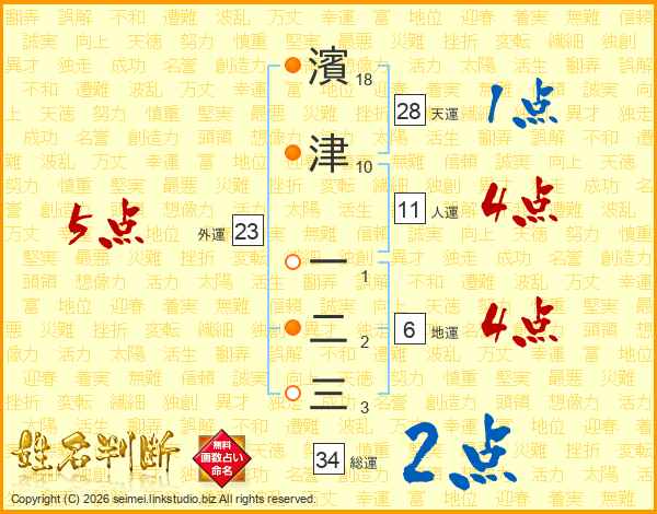 画数の奇数(○陽)と偶数(●陰)の配列で吉凶を占います。どちらかにかたよる名前は大凶名で避ける必要があります。画数の奇数偶数。