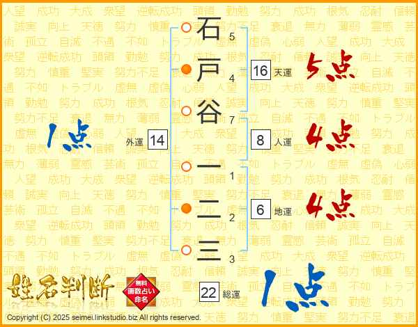 生活面を象徴する運勢です。外部から受ける影響力を表し、結婚運、家庭運や職場、環境への順応性を表します。総運から人運を引いた画数。姓や名が1文字の場合を除く。