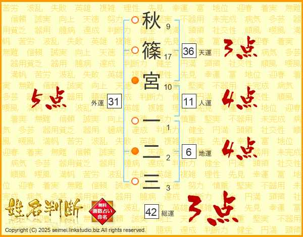 生活面を象徴する運勢です。外部から受ける影響力を表し、結婚運、家庭運や職場、環境への順応性を表します。総運から人運を引いた画数。姓や名が1文字の場合を除く。