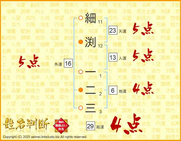 あなたの人生を表す1番重要な運勢です。生涯を通じて影響する総合運となり、主に50歳以降の晩年期に影響を及ぼします。苗字と名前の合計画数。