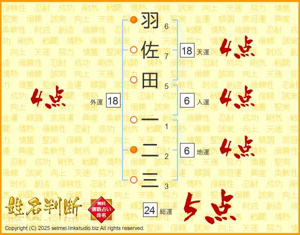 羽(6画)佐(7画)田(5画) 一(1画)二(2画)三(3画)