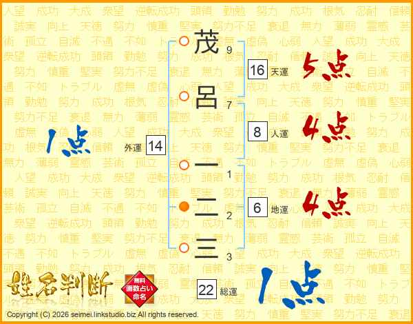 茂(9画)呂(7画) 一(1画)二(2画)三(3画)