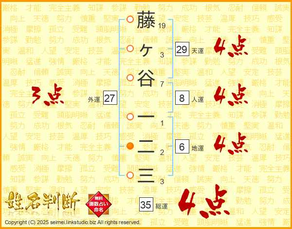 藤(19画)ヶ(3画)谷(7画) 一(1画)二(2画)三(3画)