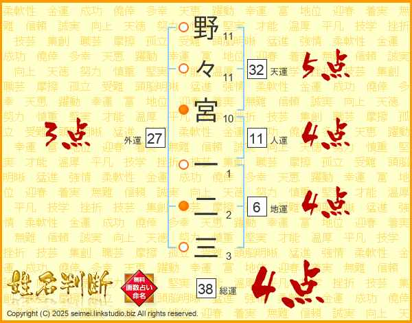 野々宮一二三さんの総運は38画の4点!