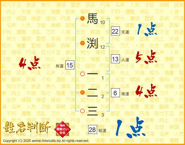 生活面を象徴する運勢です。外部から受ける影響力を表し、結婚運、家庭運や職場、環境への順応性を表します。総運から人運を引いた画数。姓や名が1文字の場合を除く。