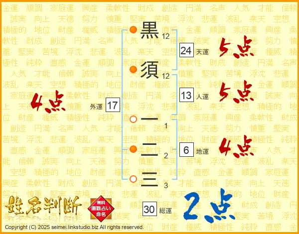 画数の奇数(○陽)と偶数(●陰)の配列で吉凶を占います。どちらかにかたよる名前は大凶名で避ける必要があります。画数の奇数偶数。