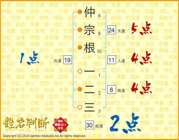 生活面を象徴する運勢です。外部から受ける影響力を表し、結婚運、家庭運や職場、環境への順応性を表します。総運から人運を引いた画数。姓や名が1文字の場合を除く。