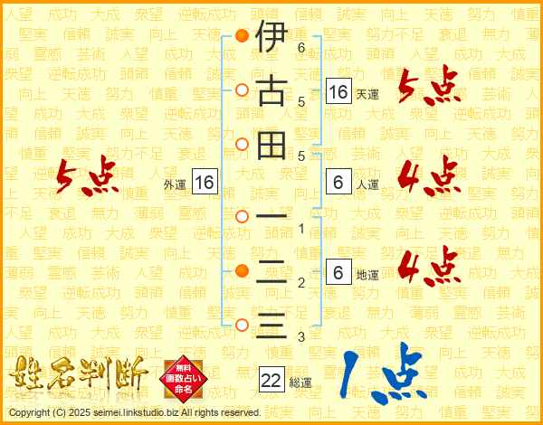 伊(6画)古(5画)田(5画) 一(1画)二(2画)三(3画)