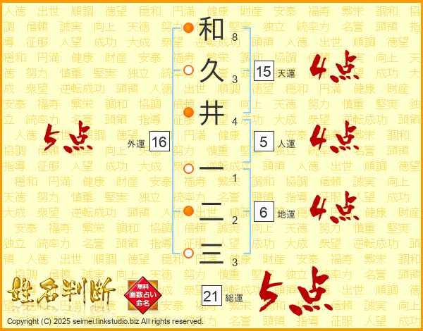 生活面を象徴する運勢です。外部から受ける影響力を表し、結婚運、家庭運や職場、環境への順応性を表します。総運から人運を引いた画数。姓や名が1文字の場合を除く。