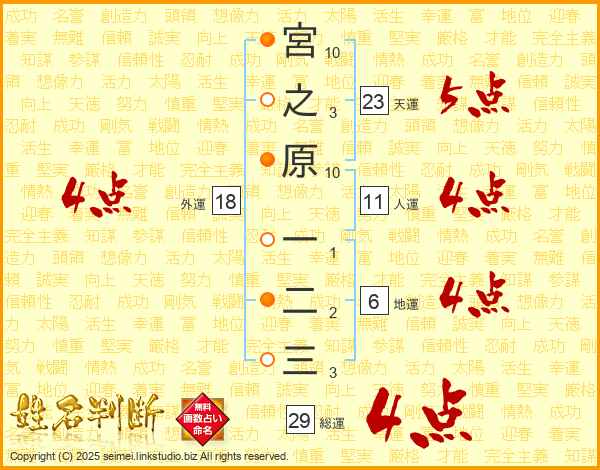 生活面を象徴する運勢です。外部から受ける影響力を表し、結婚運、家庭運や職場、環境への順応性を表します。総運から人運を引いた画数。姓や名が1文字の場合を除く。