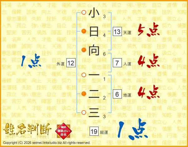 生活面を象徴する運勢です。外部から受ける影響力を表し、結婚運、家庭運や職場、環境への順応性を表します。総運から人運を引いた画数。姓や名が1文字の場合を除く。