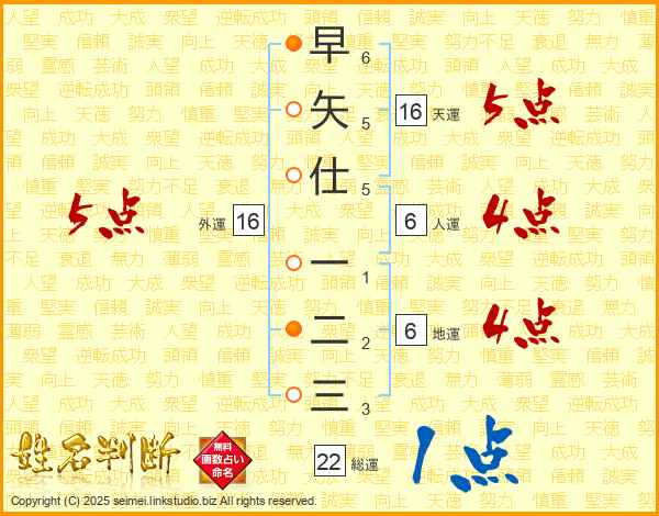 生活面を象徴する運勢です。外部から受ける影響力を表し、結婚運、家庭運や職場、環境への順応性を表します。総運から人運を引いた画数。姓や名が1文字の場合を除く。