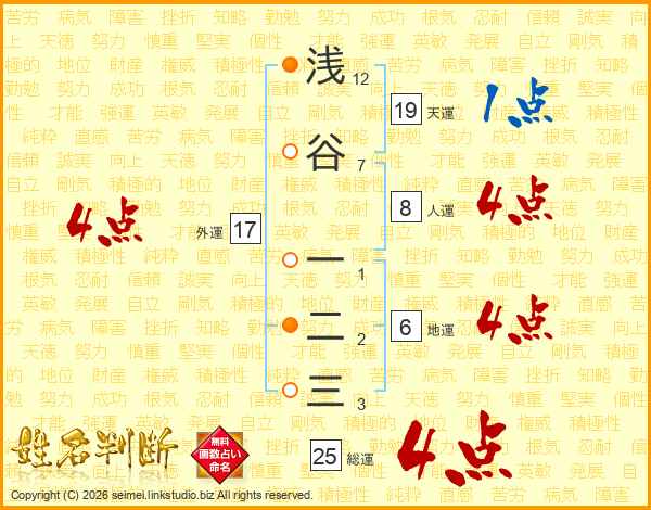 生活面を象徴する運勢です。外部から受ける影響力を表し、結婚運、家庭運や職場、環境への順応性を表します。総運から人運を引いた画数。姓や名が1文字の場合を除く。