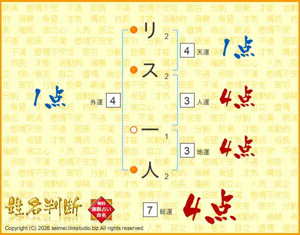生活面を象徴する運勢です。外部から受ける影響力を表し、結婚運、家庭運や職場、環境への順応性を表します。総運から人運を引いた画数。姓や名が1文字の場合を除く。