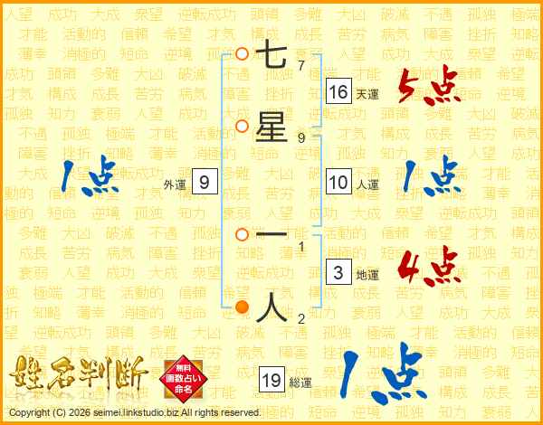 生活面を象徴する運勢です。外部から受ける影響力を表し、結婚運、家庭運や職場、環境への順応性を表します。総運から人運を引いた画数。姓や名が1文字の場合を除く。