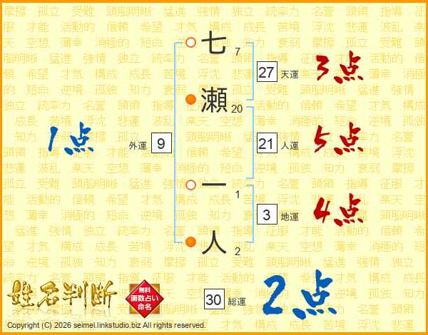 家系が持つ宿命的な運勢を表します。祖先から受け継いだ苗字ですので自分の力が及びません。家柄を象徴します。苗字の合計画数。