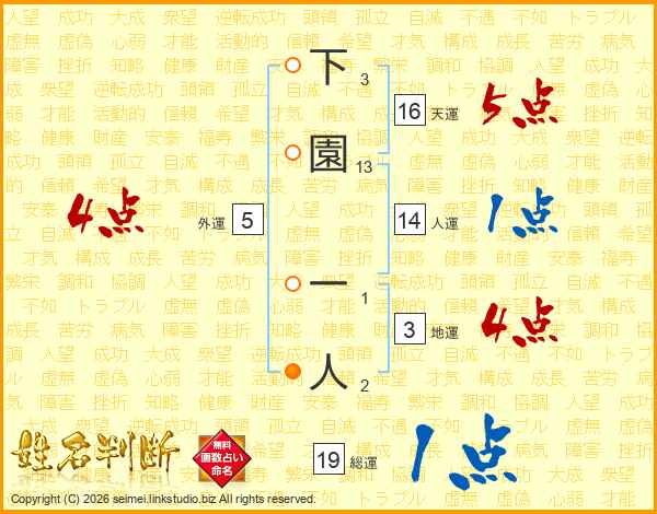生活面を象徴する運勢です。外部から受ける影響力を表し、結婚運、家庭運や職場、環境への順応性を表します。総運から人運を引いた画数。姓や名が1文字の場合を除く。