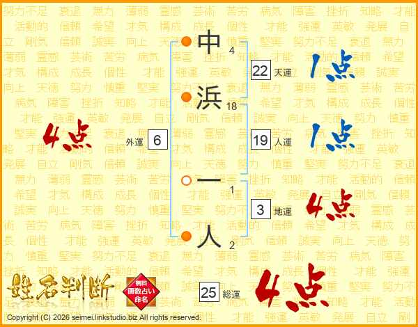 中浜一人さんの総運は25画の4点!