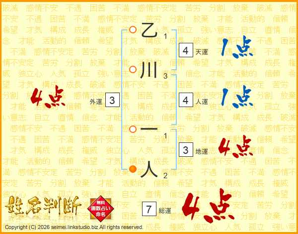 生活面を象徴する運勢です。外部から受ける影響力を表し、結婚運、家庭運や職場、環境への順応性を表します。総運から人運を引いた画数。姓や名が1文字の場合を除く。