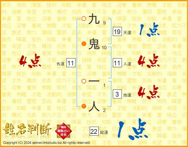 生活面を象徴する運勢です。外部から受ける影響力を表し、結婚運、家庭運や職場、環境への順応性を表します。総運から人運を引いた画数。姓や名が1文字の場合を除く。