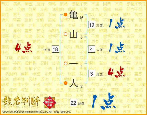 亀山一人さんの総運は22画の1点!