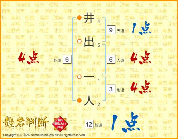 生活面を象徴する運勢です。外部から受ける影響力を表し、結婚運、家庭運や職場、環境への順応性を表します。総運から人運を引いた画数。姓や名が1文字の場合を除く。