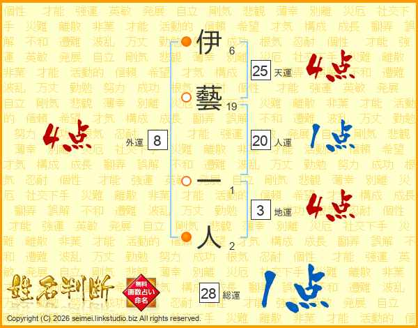 生活面を象徴する運勢です。外部から受ける影響力を表し、結婚運、家庭運や職場、環境への順応性を表します。総運から人運を引いた画数。姓や名が1文字の場合を除く。