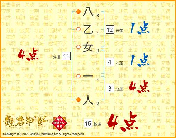生活面を象徴する運勢です。外部から受ける影響力を表し、結婚運、家庭運や職場、環境への順応性を表します。総運から人運を引いた画数。姓や名が1文字の場合を除く。