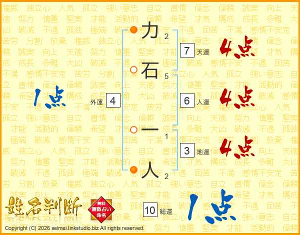 生活面を象徴する運勢です。外部から受ける影響力を表し、結婚運、家庭運や職場、環境への順応性を表します。総運から人運を引いた画数。姓や名が1文字の場合を除く。