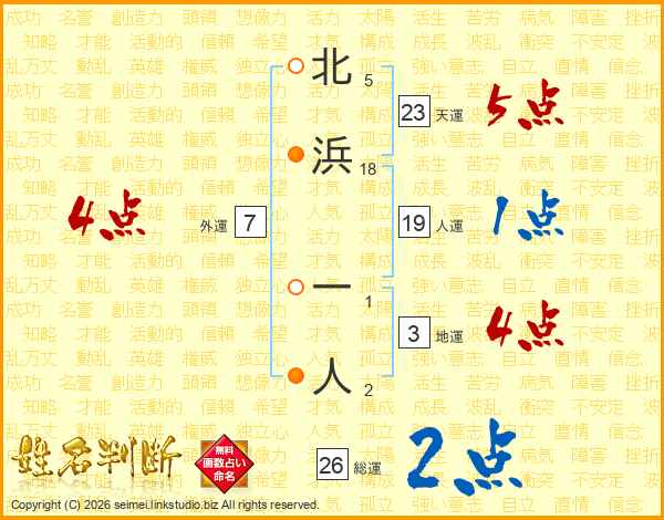 北浜一人さんの総運は26画の2点!