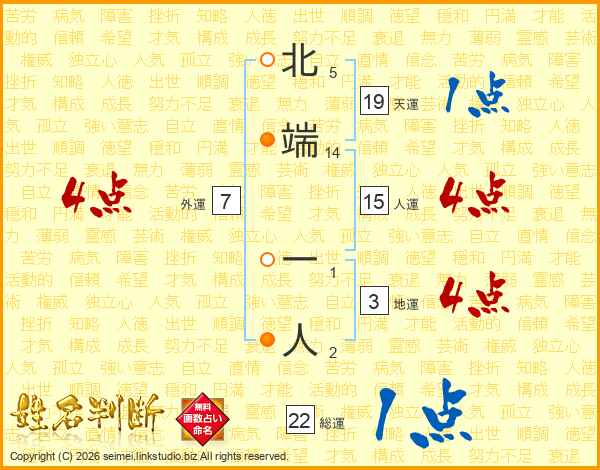 あなたの人生を表す1番重要な運勢です。生涯を通じて影響する総合運となり、主に50歳以降の晩年期に影響を及ぼします。苗字と名前の合計画数。