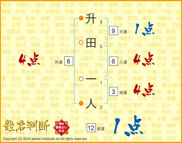 あなたの人生を表す1番重要な運勢です。生涯を通じて影響する総合運となり、主に50歳以降の晩年期に影響を及ぼします。苗字と名前の合計画数。