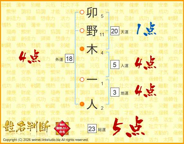 卯野木一人さんの総運は23画の5点!